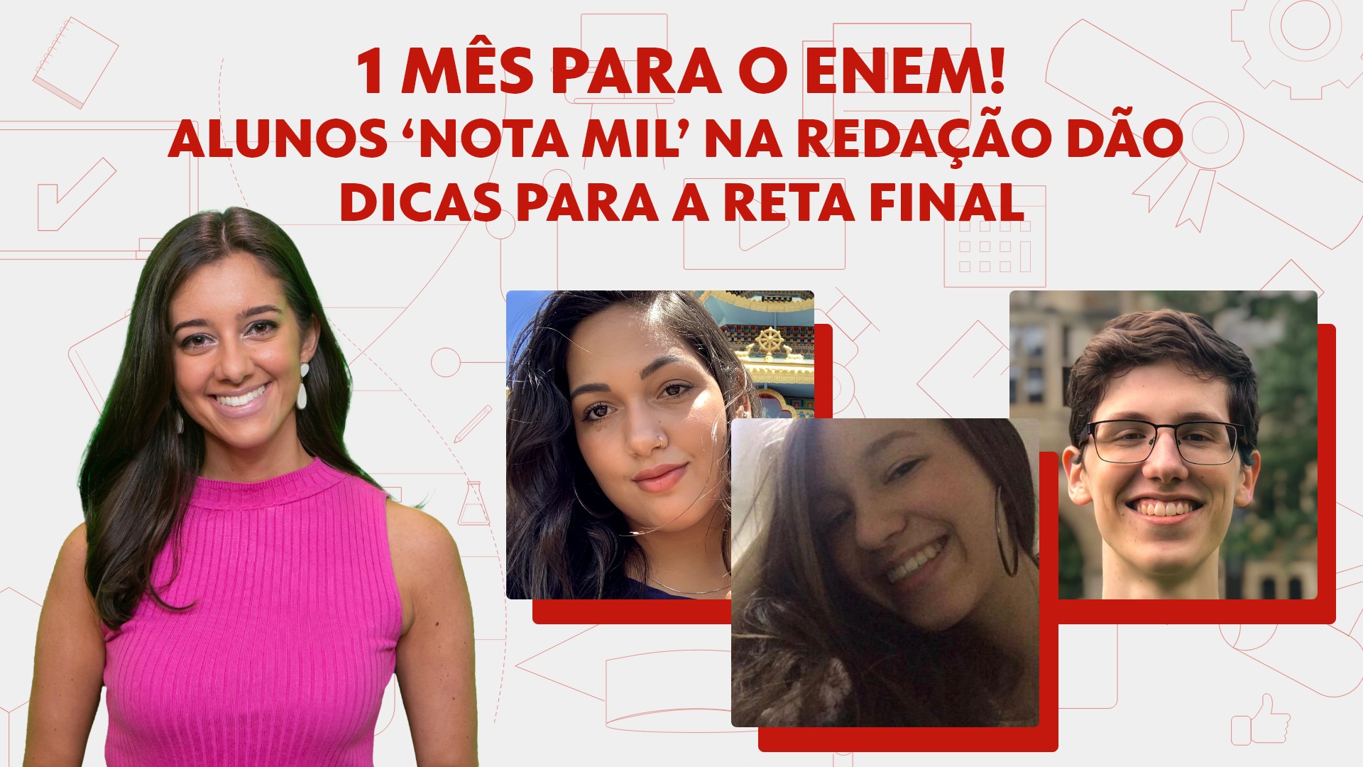 Em transmissão ao vivo no Youtube, três estudantes que tiraram a nota máxima em edições anteriores do exame contam como se prepararam. Participe e envie dúvidas! Live será às 14h desta quinta-feira (21) Arte/g1 Falta exatamente um mês para o primeiro dia do Exame Nacional do Ensino Médio (Enem) 2021, quando os candidatos terão de responder a questões de linguagens e de ciências humanas... e escrever a tão temida redação. Como usar este curto tempo até lá para estudar e garantir um bom desempenho no seu texto? O primeiro passo é assistir à live do g1 nesta quinta-feira (21), às 14h, no nosso canal do Youtube (https://www.youtube.com/c/g1), e escutar as dicas de três jovens que tiraram nota mil em suas dissertações: Lucas Felpi (Enem 2018); Isabella Bernardes (Enem 2020); Raíssa Fontoura (Enem 2020). A apresentação será da repórter de Educação Luiza Tenente. Não perca! Aproveite para mandar perguntas para eles, ao vivo, pelo Youtube. LEIA TAMBÉM: REDAÇÕES COM NOTA MÁXIMA: exemplos do Enem 2020, 2019 e 2018 DICAS DE QUEM TIROU MIL: assista ao vídeo COMO EVITAR A NOTA ZERO: veja vídeo com dicas sobre a redação 'NÃO SEI NADA DO TEMA': como 'se virar' na redação FOGUEIRA DO ENEM: game com perguntas de química, biologia, matemática e física 'G1 Enem': a série de lives de educação Para ajudar os candidatos a se preparar para Enem, o g1 estreou em setembro uma série de lives no Youtube com: revisões dos temas mais cobrados na avaliação, games de perguntas e respostas; dicas de estudos; explicações sobre os processos seletivos e bate-papos com alunos e professores. Como assistir? Para assistir ao programa, basta entrar no canal do g1 no Youtube: https://www.youtube.com/c/g1. Dica: já acesse agora a página e se inscreva - assim, você receberá um lembrete no celular quando começar a live. Como tirar mil na redação sem saber nada do tema? É importante estar preparado para saber redigir uma boa redação, mesmo se o tema for distante do universo do aluno, explica Marina Rocha, professora do Colégio e Curso AZ, no vídeo abaixo. Veja dicas: Como escapar do 'zero' na redação? Assista ao papo sobre como escapar da nota zero na redação do Enem. Participaram: Thiago Braga, professor do Colégio e Curso pH (RJ), e Larissa Cunha, que tirou 1.000 no texto do Enem 2020. Game de física O professor Idelfrânio Moreira, gerente de inovações no SAS Plataforma de Educação, lançou um desafio de física: Game de matemática O professor Rodney Luzio, do Curso Anglo (SP), listou os 5 tópicos que aparecem mais frequentemente em matemática e resolveu perguntas sobre eles. Assista: Game de biologia Já tivemos também "Fogueira do Enem" de biologia. O professor Kennedy Ramos, da plataforma "Bioexplica", desafiou a aluna Ana Luiza Rodrigues com questões sobre Covid-19: Game de química Na estreia da live, em 2 de setembro, o estudante Douglas Santos, de 18 anos, participou do quadro "Fogueira do Enem". Na ocasião, o professor Phelippe Spitaleri, do curso Anglo, explicou (com bom humor) temas como cadeias carbônicas e equilíbrio em soluções: Redações nota mil Tivemos também uma live "G1 Enem" sobre redações nota mil: Initial plugin text Outros vídeos de Educação