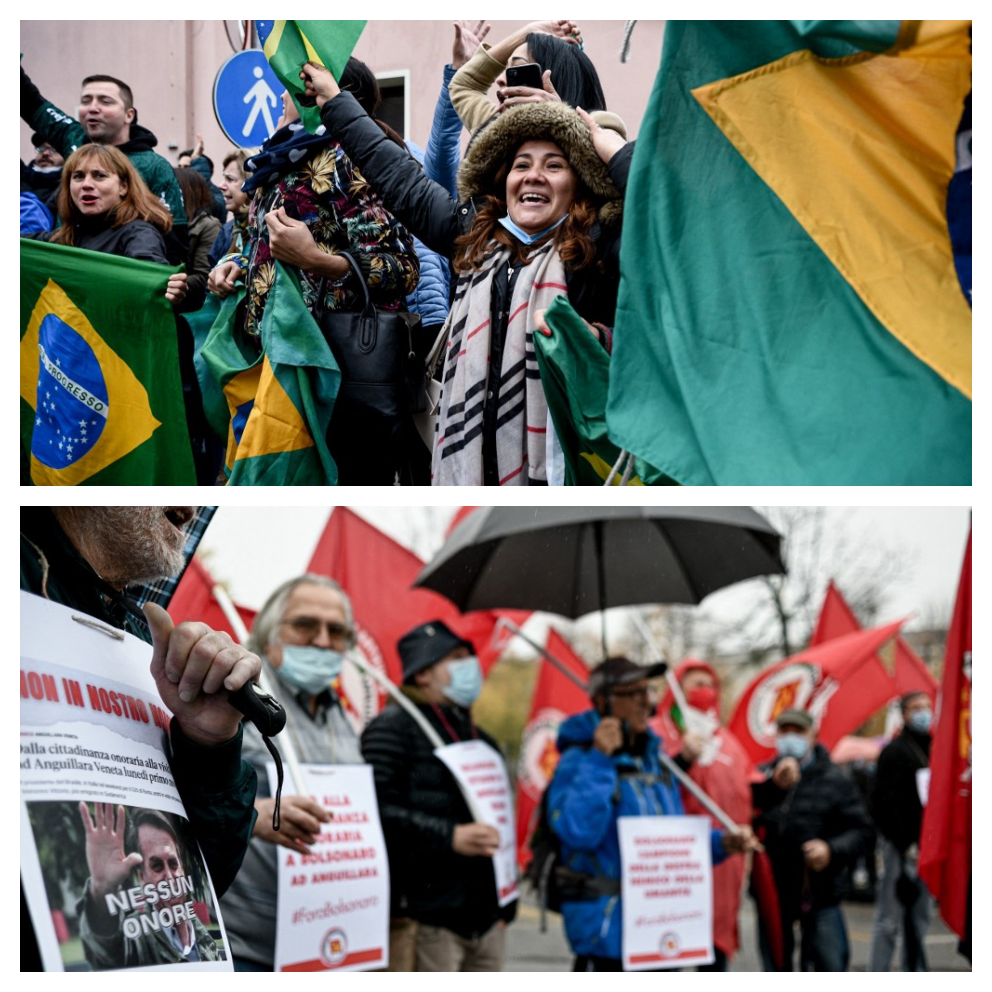 O presidente foi a Anguillara Veneta, cidade de um de seus antepassados que hoje é governada por um partido de extrema-direita, para receber título de cidadão honorário. Bolsonaro é recebido em cidade italiana com manifestações contra e a favor Manifestantes contrários e favoráveis ao presidente do Brasil, Jair Bolsonaro, foram à cidade de Anguillara Veneta, no norte da Itália, onde ele deverá receber o título de cidadão honorário da cidade em uma cerimônia oficial na prefeitura. Compartilhe esta notícia no WhatsApp Compartilhe esta notícia no Telegram Um bisavô de Bolsonaro emigrou de Anguillara Veneta para o Brasil. Hoje, a cidade tem cerca de 4 mil moradores e é governada pela Liga, partido de extrema-direita. Depois do evento, o presidente brasileiro deve almoçar com vários membros da família Bolsonaro, alguns parentes próximos, em uma elegante residência do século 17 da região. LEIA TAMBÉM Proposta de dar título de cidadão honorário a Bolsonaro gera polêmica na Itália Diocese de Pádua diz que homenagem a Bolsonaro causa 'grande constrangimento' VÍDEO: Bolsonaro hostiliza repórteres em Roma, e segurança agride jornalistas Manifestações a favor e contra o presidente do Brasil, Jair Bolsonaro, em Anguillara Veneta, na Itália, em 1º de novembro de 2021 Piero Cruciatti /AFP Manifestações contrárias Sob uma chuva persistente e em meio à neblina, representantes de vários partidos de esquerda, de sindicatos e da associação antifascista ANPI protestaram com bandeiras e cartazes contra a honraria ao presidente brasileiro. "Que visite a cidade de onde vem sua família é justo, mas não que o apresentem como um modelo a seguir com a concessão do título de cidadão honorário", disse Antonio Spada, vereador da oposição. "Fora Bolsonaro", afirmava um cartaz, enquanto outro, escrito a mão, declarava "Anguillara ama o Brasil, mas não Bolsonaro". Imagem de protesto contra o presidente Jair Bolsonaro em Anguillara Veneta Piero Cruciatti / AFP Entre os manifestantes mais indignados estava o missionário italiano Massimo Ramundo, que viveu por 20 anos no Brasil, sendo 12 deles no Maranhão (estado que tem 34% do território ocupado pela floresta amazônica). "É uma vergonha. Estou furioso com a prefeita desta cidade. Ela não sabe o que Bolsonaro fez e disse, não escutou suas declarações de teor racista, contra os indígenas, os vacinados, as mulheres. Além disso, ele quer que a Amazônia seja um negócio. Não respeita os valores do papa Francisco", afirmou o religioso. Em Anguillara Veneta, mulheres fixam faixa em italiano onde se afirma que o título de cidadão honorário não deveria ser dado como um presente, mas, sim, conquistado; manifestantes protestaram contra o presidente Jair Bolsonaro, em 1º de novembro de 2021 Piero Cruciatti/ AFP Manifestantes pró-Bolsonaro Grupos de simpatizantes do presidente também se manifestaram. "Estou aqui para dizer que não está sozinho", declarou Silvana Kowalsky, 50 anos, que viajou de Vicenza, a 85 quilômetros de distância, para expressar seu apoio. Com chapéus e bandeiras do Brasil, os simpatizantes do presidente preparam-se para defender a homenagem. "É um grande presidente e tem o direito, porque é descendente de italianos. Tudo o que a CPI (do Senado) fala dele é mentira", afirmou o brasileiro Cláudio Resende, de 65 anos, que mora na Itália há 17 anos. VEJA TAMBÉM: Bolsonaro mente em conversa com presidente da Turquia sobre situação da economia brasileira YouTube remove nova live de Bolsonaro replicada no canal de Carlos Bolsonaro Manifestantes a favor de Jair Bolsonaro em Anguillara Veneta, na Itália, em 1º de novembro de 2021 Piero Cruciatti / AFP Veja os vídeos mais assistidos do g1
