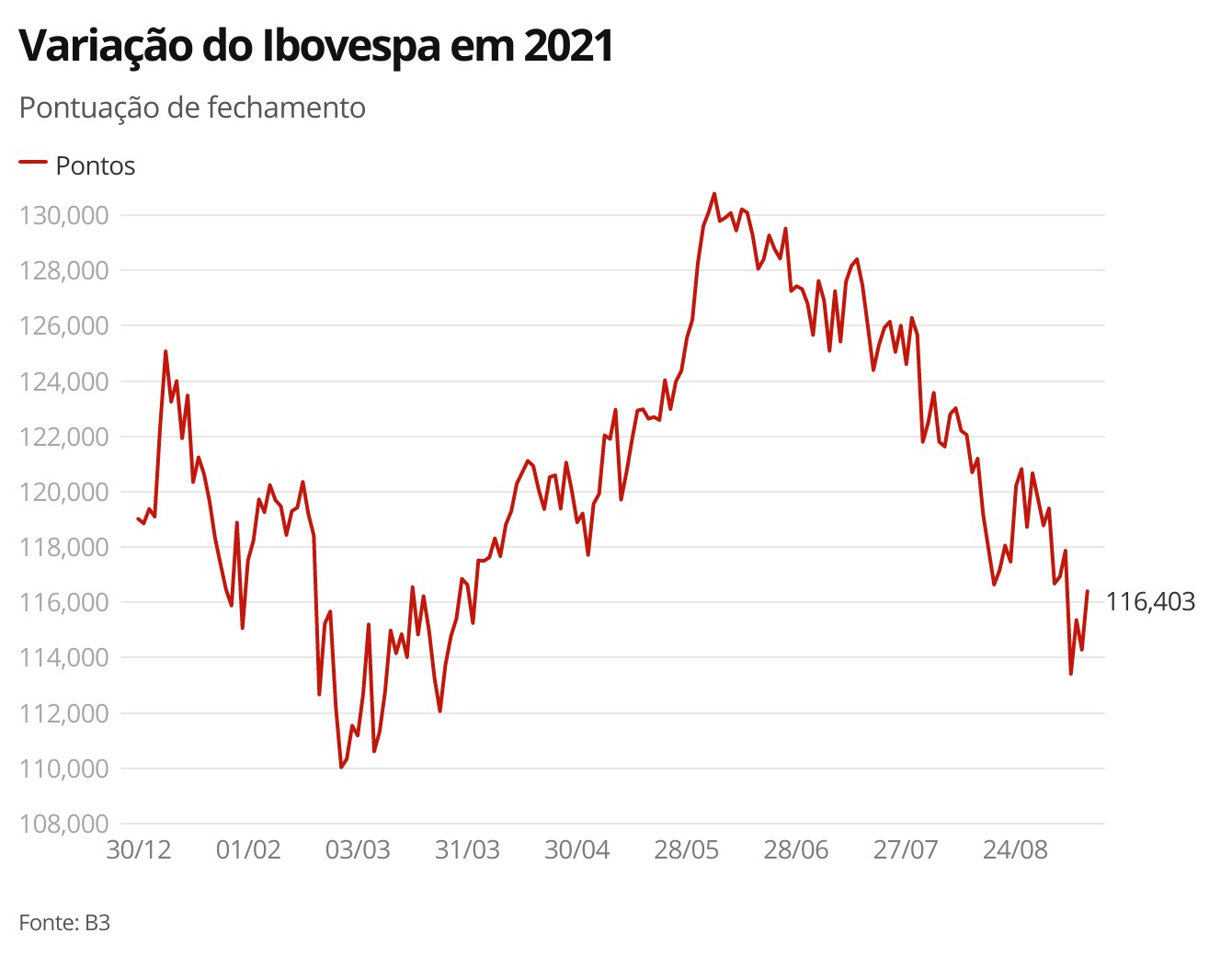 Na segunda-feira, o principal índice da bolsa de valores subiu 1,85%, a 116.403 pontos. O principal índice de ações da bolsa de valores de São Paulo, a B3, opera em alta nesta terça-feira (14), de olho nos dados de inflação nos Estados Unidos e do setor de serviços por aqui. Às 10h29, o Ibovespa subia 0,65%, a 117.163 pontos. Veja mais cotações. Na segunda-feira, a bolsa fechou em alta de 1,85%, a 116.403 pontos. Com o resultado, o Ibovespa passou a acumular recuo de 2% no mês. No ano, a perda é de 2,2%. Cenário Nos Estados Unidos, o Departamento do Trabalho informou que a inflação voltou a perder força no país em agosto, ficando em 0,3%, ante 0,5% no mês anterior – e indicando uma desaceleração da recuperação econômica e menor pressão por alta dos juros. Na agenda de indicadores, o IBGE divulgou mais cedo que o setor de serviços subiu 1,1% em julho, na quarta alta seguida. Na segunda-feira, o mercado financeiro subiu sua estimativa para o Índice de Preços ao Consumidor Amplo (IPCA) deste ano para 8%, segundo pesquisa Focus divulgada nesta segunda pelo Banco Central. Para 2022, a projeção também foi elevada, de 3,98% para 4,03%. Para o Produto Interno Bruto (PIB), os analistas reduziram a estimativa de alta em 2021, de 5,15% para 5,04%. O mercado segue de olho em Brasília, após as fortes turbulências após os atos antidemocráticos de 7 de Setembro, das falas golpistas do presidente e após a carta de 'pacificação' publicada por ele. LEIA TAMBÉM: Golpismo de Bolsonaro prejudica retomada da economia e crise pode se acentuar; entenda Variação do Ibovespa em 2021 Economia G1