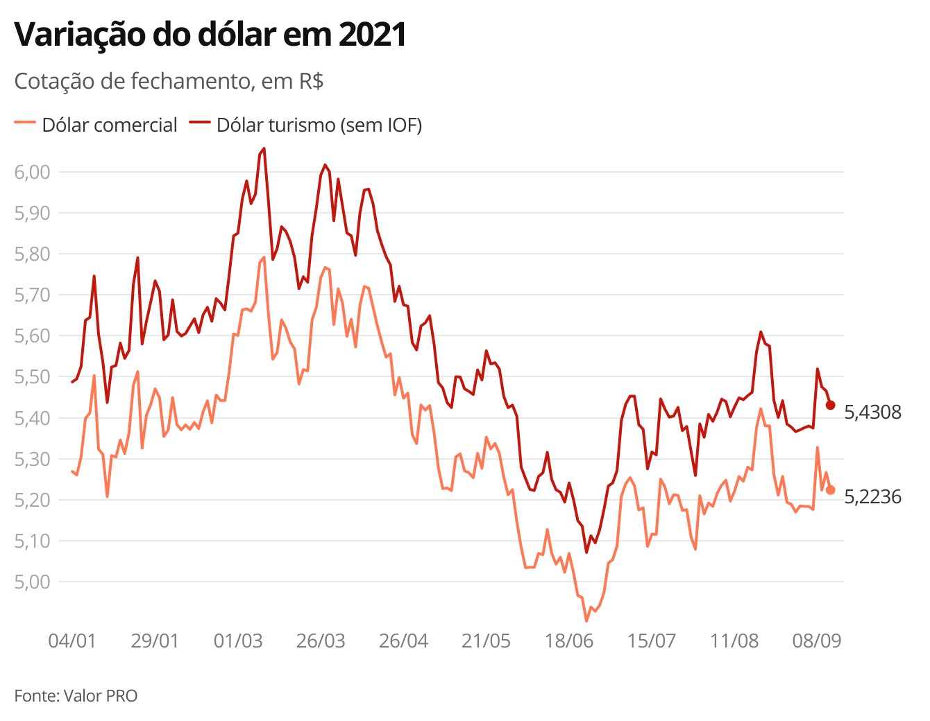 Na segunda-feira (13), moeda norte-americana recuou 0,81%, cotada a R$ 5,2236. O dólar opera em queda nesta terça-feira (14), após dados mostrarem desaceleração da inflação nos Estados Unidos, indicando perda de força na economia do país e reduzindo as expectativas por alta nos juros. Às 10h29, a moeda norte-americana era vendida a R$ 5,2145, em queda de 0,17%. Veja mais cotações. Na segunda-feira, o dólar em queda de 0,81%, a R$ 5,2236. Com o resultado acumula alta de 1,04% no mês e de 0,7% no ano. s Ex-diretor do Banco Central comenta perspectivas para a inflação e para a economia Cenário Nos Estados Unidos, o Departamento do Trabalho informou que a inflação voltou a perder força no país em agosto, ficando em 0,3%, ante 0,5% no mês anterior – e indicando uma desaceleração da recuperação econômica e menor pressão por alta dos juros. Na agenda de indicadores, o IBGE divulgou mais cedo que o setor de serviços subiu 1,1% em julho, na quarta alta seguida. Na segunda-feira, o mercado financeiro subiu sua estimativa para o Índice de Preços ao Consumidor Amplo (IPCA) deste ano para 8%, segundo pesquisa Focus divulgada nesta segunda pelo Banco Central. Para 2022, a projeção também foi elevada, de 3,98% para 4,03%. Para o Produto Interno Bruto (PIB), os analistas reduziram a estimativa de alta em 2021, de 5,15% para 5,04%. O mercado segue de olho em Brasília, após as fortes turbulências após os atos antidemocráticos de 7 de Setembro, das falas golpistas do presidente e após a carta de 'pacificação' publicada por ele. LEIA TAMBÉM: Golpismo de Bolsonaro prejudica retomada da economia e crise pode se acentuar; entenda 1xVelocidade de reprodução0.5xNormal1.2x1.5x2x Variação do dólar em 2021 G1 1xVelocidade de reprodução0.5xNormal1.2x1.5x2x