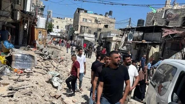 Pessoas estão indo às ruas para verificar os danos causados por Israel. Clima em Jenin é tenso. A ONU disse que houve danos às redes de água e energia dentro do campo. BBC A atmosfera no campo de refugiados de Jenin parece com a que já testemunhei em outro lugar — em Gaza, depois das guerras com Israel. Mas esta é a Cisjordânia ocupada, onde a dinâmica é muito diferente. Agora parece haver uma escalada rápida para algo muito mais perigoso. A destruição no campo após o maior ataque do exército israelense em 20 anos é enorme. Quando centenas de soldados entraram no campo na manhã de segunda-feira (3/7), o Exército disparou mísseis a partir de drones — ataques aéreos não são usados na Cisjordânia há duas décadas — e destruiu estradas para limpá-las do que argumentou serem bombas de militantes. Tiroteios começaram entre as tropas israelenses e os militantes palestinos e continuaram até a retirada das tropas israelenses na noite de terça-feira (4). Entenda conflito na Cisjordânia Agora, pela primeira vez em segurança desde domingo (2), milhares de moradores vieram às ruas para ver a destruição. Eles escalam os escombros, tiram fotos dos destroços com seus celulares e comparam experiências, falando sobre casas invadidas, filhos detidos e mortos na família. Um homem se aproxima de mim dizendo que isso o lembra de fotos da Turquia e da Síria no início deste ano, após o terremoto. Milhares compareceram aos funerais dos 12 palestinos mortos durante a operação israelense BBC Carros estão esmagados ao longo do caminho por onde passaram os blindados D9 de Israel. O asfalto está quebrado, espalhado por toda parte em pedaços enormes. Caminhamos pelo que havia embaixo das ruas: entulho, areia e poeira. Muitas casas não têm água ou energia. Voluntários trazem caixas de água engarrafada. Eles se juntam a outros trabalhadores, alguns dirigindo as poucas escavadeiras disponíveis. Uma delas faz a remoção de uma árvore caída do alto de um prédio residencial. Ela arranca parte da fachada de uma loja no térreo, caindo perigosamente perto de nós. Os comboios blindados israelenses retiraram-se durante a noite em meio a intensos tiroteios com militantes. Apesar da calmaria de hoje, todos temem que mais coisas estejam por vir. Israel diz que continuará realizando esse tipo de operação "enquanto for necessário para erradicar o terrorismo". Grupos militantes palestinos reivindicam "vitória" e juram vingança. Continuamos nosso caminho pelo acampamento e as procissões fúnebres começam. Milhares de pessoas em luto cantam enquanto carregam macas com os corpos de alguns dos 12 palestinos mortos desde segunda-feira (3). Quatro deles tinham menos de 18 anos. Israel disse que tinha como alvo militantes. Jenin é uma cidade que escapou do controle da Autoridade Palestina BBC Filas de pessoas se juntam. Enquanto marcham, alguns homens estão mascarados e armados; outros usam símbolos da Jihad Islâmica. Bandeiras do Hamas tremulam sobre um prédio próximo. A raiva toma conta da multidão enquanto se ela dirige para as casas dos mortos, onde suas mães e esposas os aguardam. Mas as exibições de poder de fogo — pelo menos em público — parecem menos intensas do que em funerais anteriores. Tenho visitado Jenin frequentemente no último ano e meio, quando uma nova geração de militantes armados se formou, rejeitando a envelhecida liderança palestina e desafiando o exército israelense durante seus crescentes ataques à cidade. Esta é uma geração que acredita que a Autoridade Palestina (AP) oficial vendeu seu futuro e se tornou pouco mais do que uma empresa de segurança para a ocupação militar de Israel, que garante a expansão dos assentamentos israelenses na Cisjordânia, construídos na terra que os palestinos querem para um Estado futuro e ilegal sob o direito internacional. Hoje há menos tiros, mas a frustração só aumenta. Durante a noite, jovens palestinos também entraram em confronto com as forças de segurança formais da Autoridade Palestina. Jenin é uma cidade que já escapou de seu controle. Agora, os resquícios institucionais de um processo de paz de três décadas na Cisjordânia ocupada estão sendo testados até a destruição. Israel diz que continuará erradicando o que chama de "uma cidade de refúgio para o terrorismo" em Jenin, mas as facções militantes palestinas prometem que intensificarão suas atividades. Um ataque com carro e faca em Tel Aviv na terça-feira, que feriu sete israelenses, foi descrito pela Jihad Islâmica como a "primeira resposta" ao que estava acontecendo em Jenin. A crescente violência é mais um sinal do colapso de qualquer horizonte político. Alguns temem que as cidades palestinas na Cisjordânia sofrerão ataques militares mais intensivos e medidas de segurança — como se vê em Gaza, que é governada pelo Hamas e isolada por Israel. Mais palestinos rejeitam sua própria liderança reconhecida internacionalmente e apoiam a resistência armada. E Israel permanece sob o controle do governo mais extremista já eleito, que prometeu estend